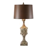 The Grand Swag Lamp is hand carved with a chipped paint finish in grey, white and soft blue but the detail does not stop there. It continues up to the shade which is illuminated by two bulbs that help set off the hand painted shade in rustic brown. The shade is made of wood and hand finished to create the aged feel. By pulling the chains on the sockets you will see the beauty of the lamp increase as the light reflects off the interior of the shade casting a warm glow. This lamp comes with a single shade. The shade is hand painted brown. 39" T x 17" W x 17" D Color: weathered grey, white, soft blue Material: Carved wood with wood shade 100 watt max standard bulb Tea stained fabric covered cord; 6-7 feet of cord